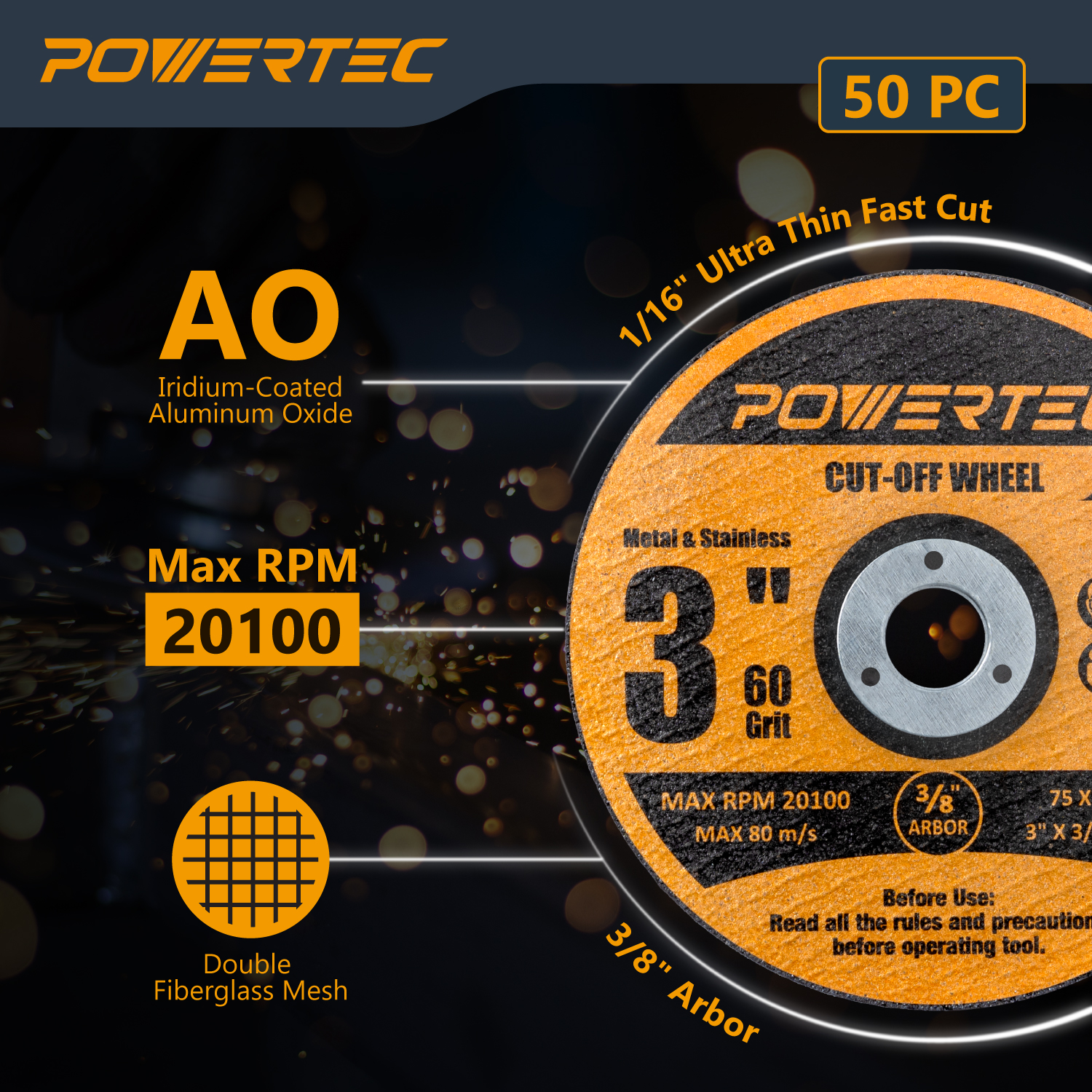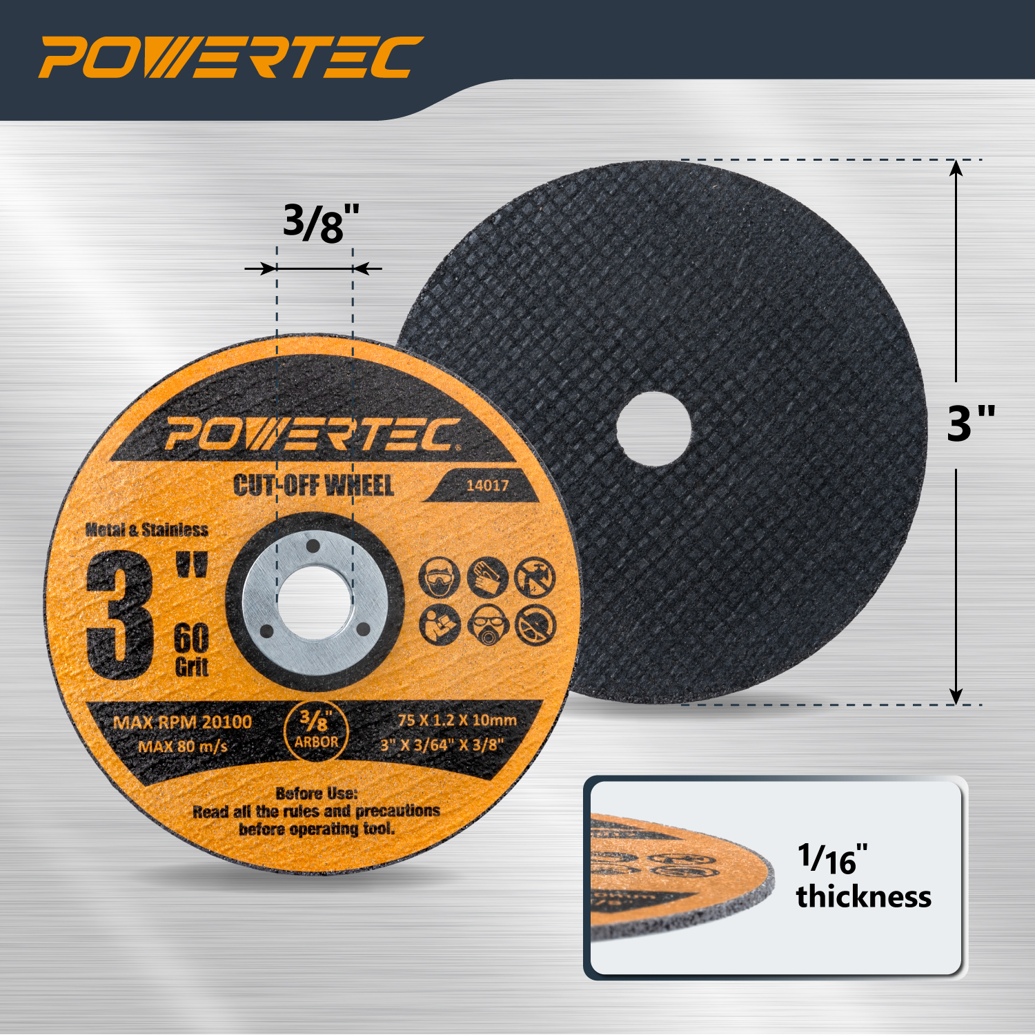The POWERTEC 3" Cut Off Wheels deliver fast, precise, and efficient cuts on metal, stainless steel, sheet goods, and rebar. With an ultra-thin 1/16" profile and premium abrasive technology, these discs minimize burrs and material waste for professional-grade performance.