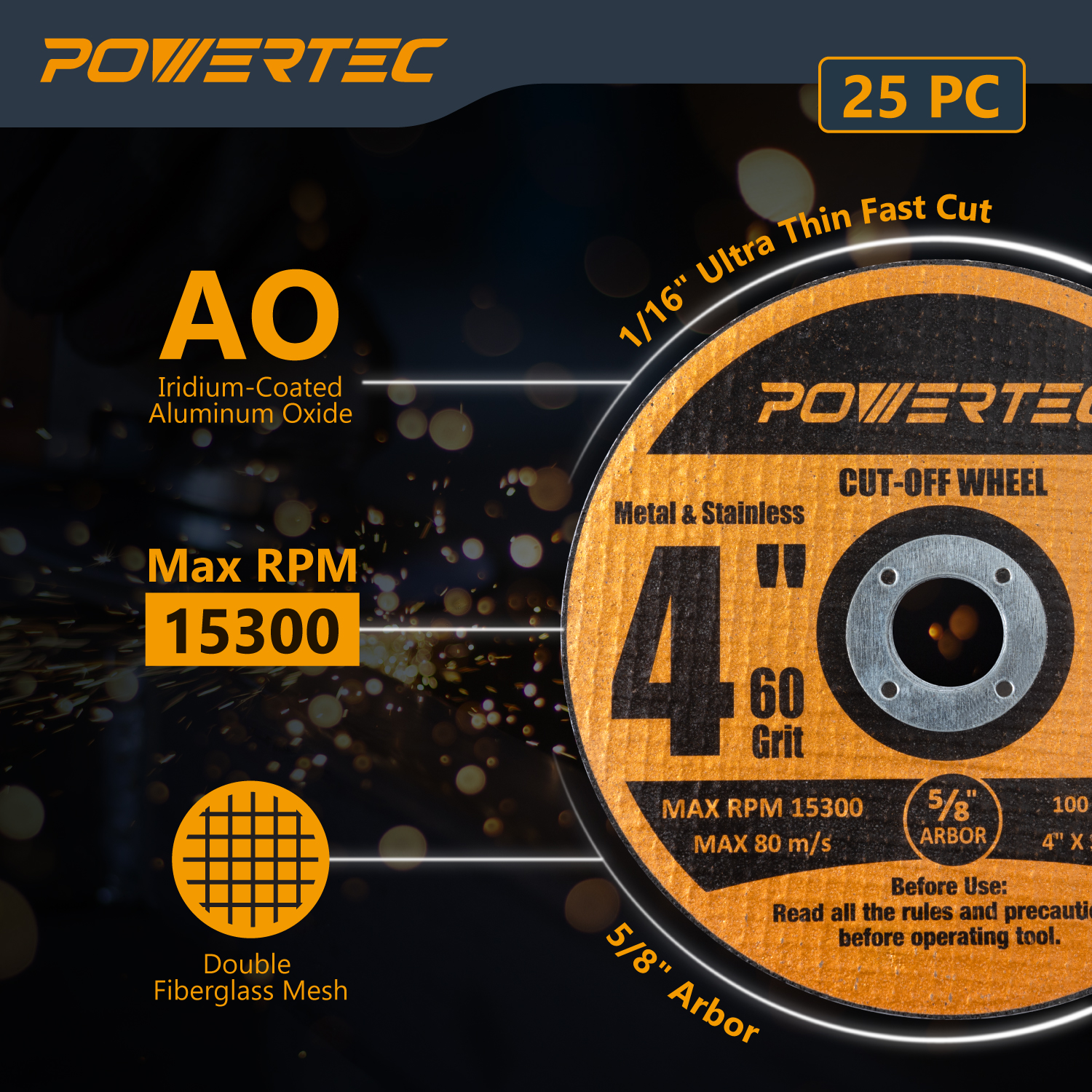 The POWERTEC 4" Cut Off Wheels deliver fast, precise, and burr-free cuts on stainless steel, sheet metal, pipes, rebar, and auto body panels. With a thin 1/16" kerf, these cutting discs reduce material waste while maximizing accuracy and speed.
