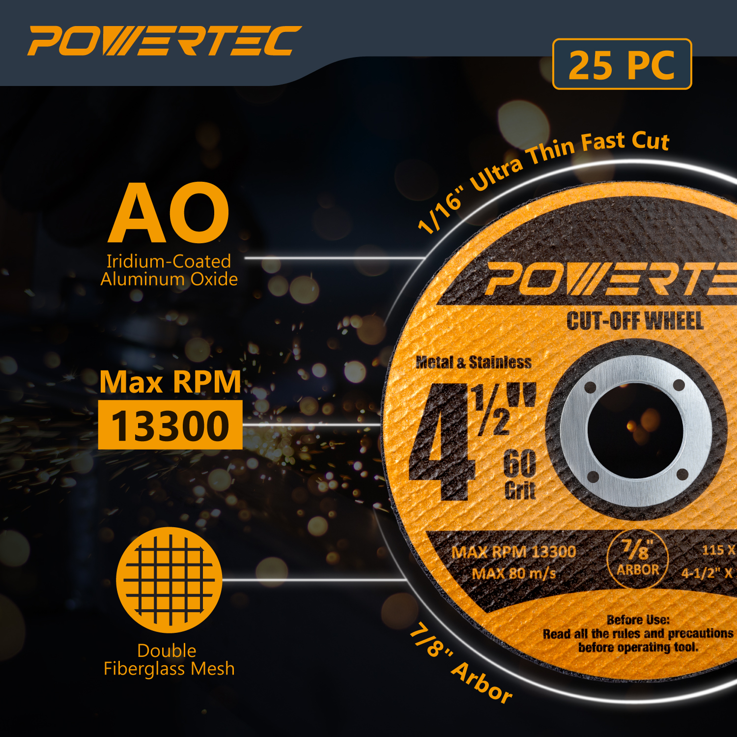 The POWERTEC 4-1/2" Cut Off Wheels provide fast, clean, and precise cutting performance on stainless steel, sheet metal, pipes, rebar, and auto body panels. Featuring a thin 1/16" kerf, these wheels reduce material waste while delivering efficient cutting results.