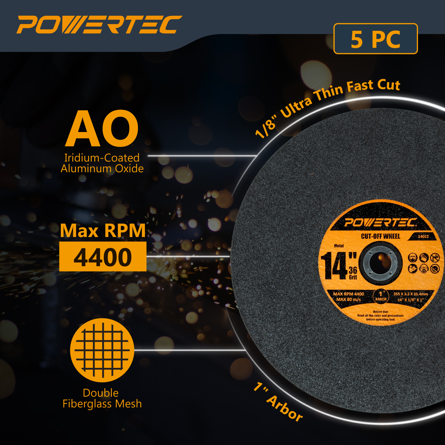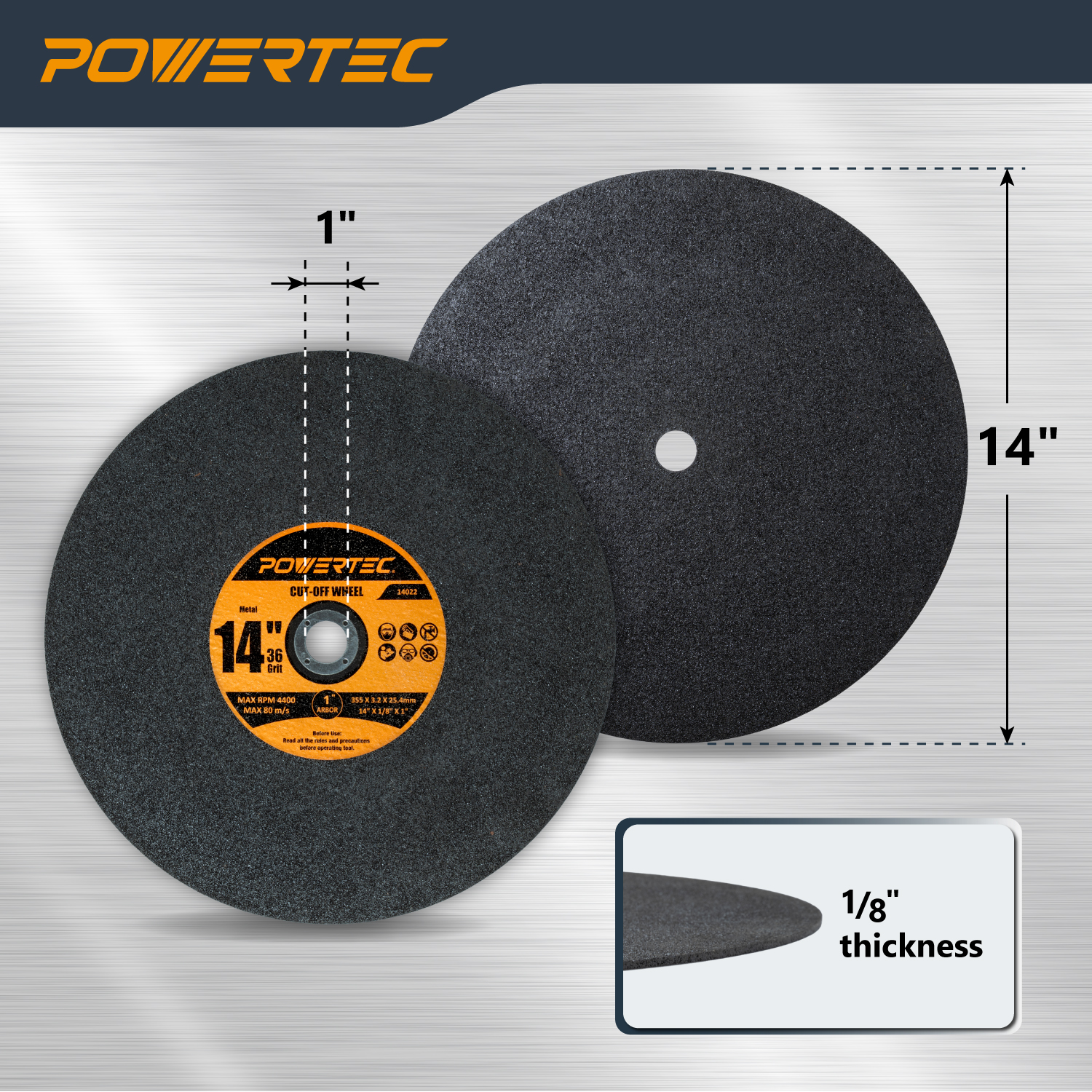 The POWERTEC 14" Cut Off Wheels are engineered for heavy-duty cutting applications on stainless steel, sheet metal, steel pipe, rebar, and auto body panels. With a durable 1/8" kerf and coarse 36-grit abrasive, these wheels deliver aggressive cuts while minimizing burrs and ensuring consistent results.