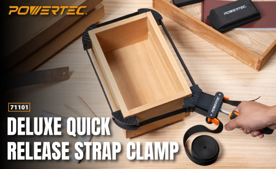 The POWERTEC Deluxe Band Clamp with Quick-Release Lever is ideal for use with square, round and atypical-shaped stock.