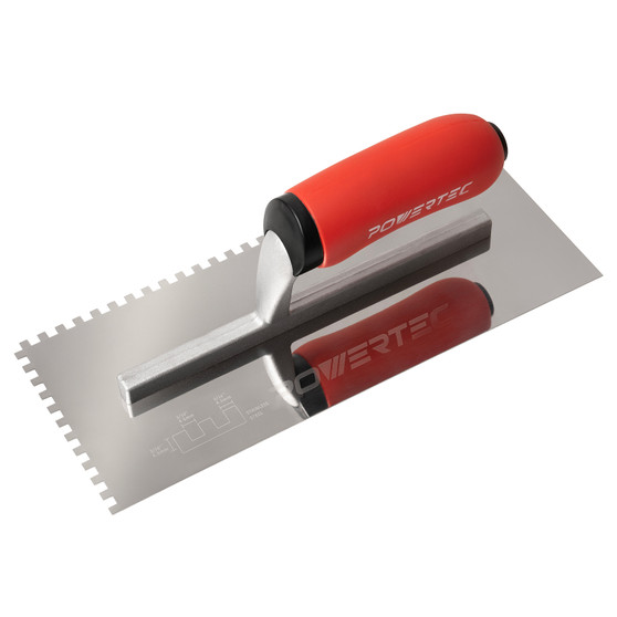 The POWERTEC 72206 Stainless Steel Trowel with 3/16'' x 3/16'' square notch is your go-to tool for clean, consistent mortar application. Whether you're working with tile, cement, or masonry, the premium stainless steel blade offers rust-resistant performance and long-lasting durability. Its square notches ensure even adhesive distribution for a secure tile bond, while the ergonomic soft-grip handle keeps your hand comfortable during long tiling sessions. Ideal for both professionals and serious DIYers, this trowel delivers accuracy, control, and efficiency on every job
